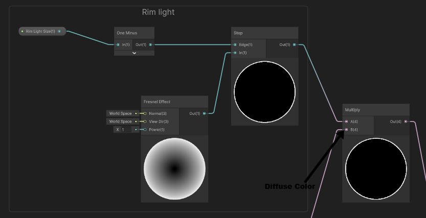 It's essentially a light outline which always appears around the character updating from the angle we are looking at it, and its color is the one that the light reflects from each part of the object (if one part of the object is blue the glow will be blue but if another part is white the glow will be white, etc.). This is achieved through a step between the desired size of this light and a Fresnel Effect, manipulating the Fresnel Effect to achieve the desired size of the light. A value size of 1 means the entire model is filled with this light. The light expands and contracts from the edges of the model towards the center or vice versa.