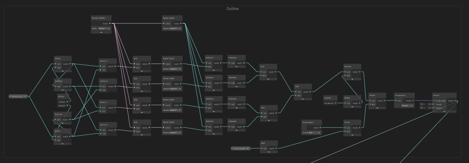 The entire size of the outline is controlled by the user through the outline size, which calculates how much the depth textures shift in each direction per pixel. To achieve this, screen width and height are utilized, and instead of subtracting two shifted depth textures, all four diagonals are used to appear more balanced. The values of the four diagonals are then added to the initial depth texture and subtracted from the initial depth texture, transforming them into absolute values. To ensure that the outline is equally visible in both the Scene view and the Game view, I multiplied the division of the camera far plane by 10. However, this introduced another issue - a white background now appeared in the scene. To address this, I implemented a fade controlled by the user, causing the outline to fade even more with distance. I took the power of the scene depth in eye mode, which converts the depth into eye space units, using the value of this fade, and divided the current output by the result of this power. In the end, only 0 or 1 is retained using a compare node and I performed a linear interpolation (lerp) between the lighting color and the outline color using the outline.