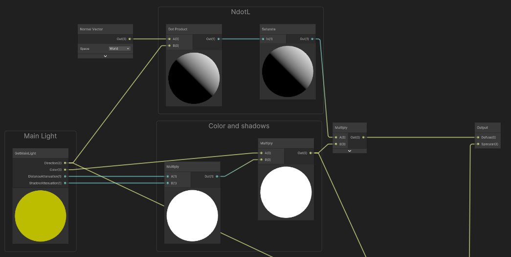 In the Shader Graph, the Distance Attenuation and Shadow Attenuation are multiplied to obtain a final shadow value. This value is then multiplied by the color and, finally, by the result given by the light to calculate the Lambert lighting model with shadows.