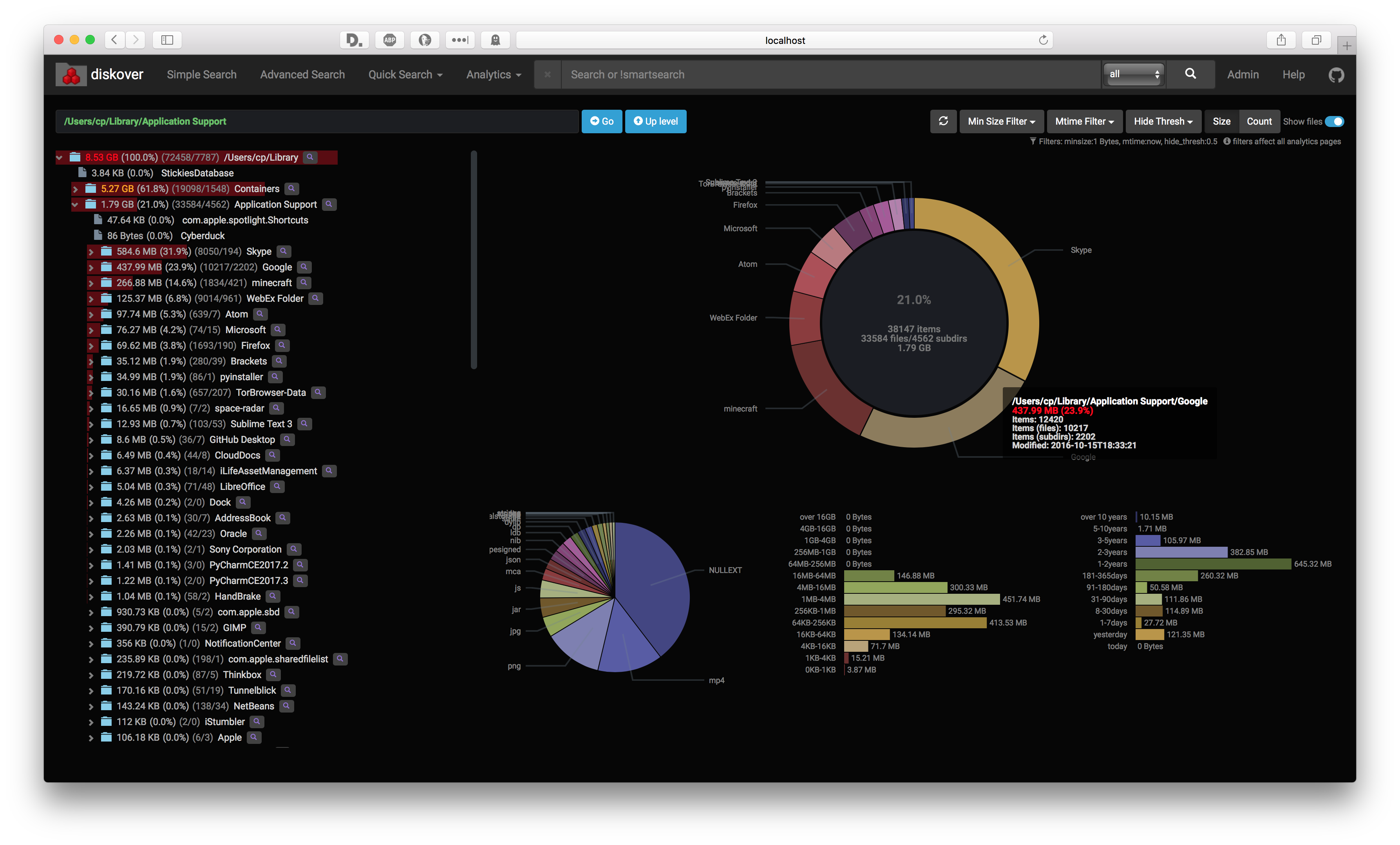 diskover-web is an open source web file manager, disk space usage, storage analytics and file search engine for diskover. It is designed to help you quickly search across your storage servers using your diskover Elasticsearch indices. With diskover-web you can visualize the file system meta data from your diskover crawls and get better insights into your data by viewing detailed disk usage analytics of your file systems.