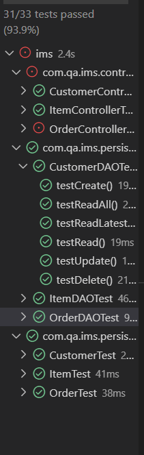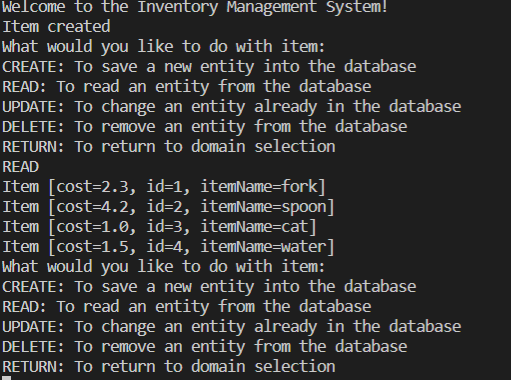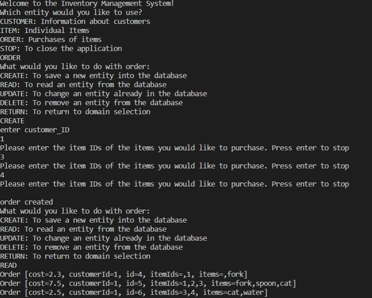 The brief for this project was to design and produce an application that an end user can interact with via a CLI. The application needed to be an inventory management system that can carry out the following functions: • Add a customer to the system • View all customers in the system • Update a customer in the system • Delete a customer in the system. • Add an item to the system • View all items in the system • Update an item in the system • Delete an item in the system • Create an order in the system. • View all orders in the system. • Delete an order in the system • Add an item to an order. • Calculate a cost for an order. • Delete an item in an order