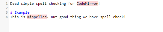 Spell checking so simple, you can set up in 60 seconds. It will highlight any misspelled words in light red. Works great in conjunction with other CodeMirror modes, like GitHub Flavored Markdown.