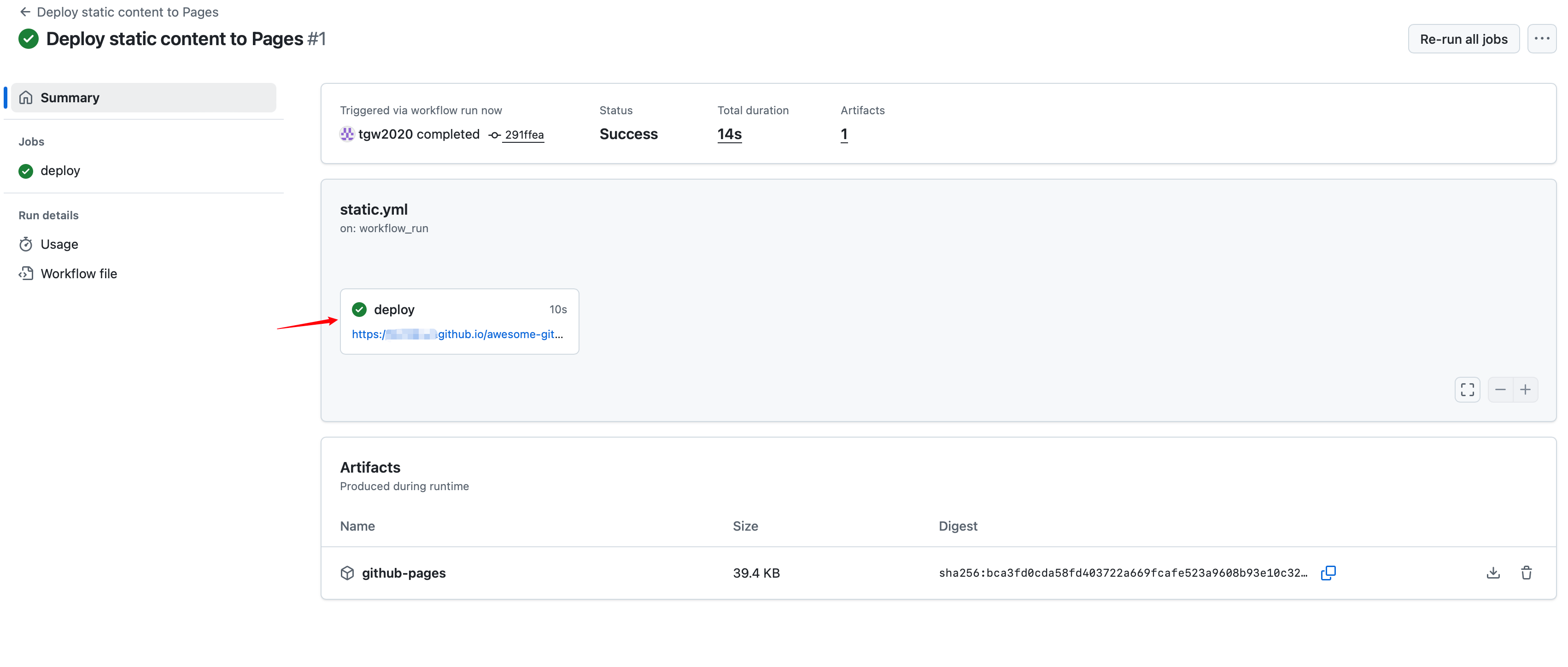 如果 Deploy static content to Pages 工作流执行顺利的话,会生成一个项目地址,点击就可以看到我们部署的页面了。