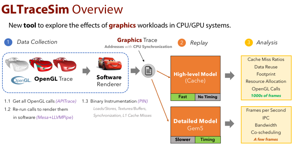 GLTraceSim's Gem5 Extension is an addition to the Gem5 Simulator that replays the GLTraceSim traces, feeding the memory access into Gem5's memory system, to obtain performance and bandwidth numbers of these applications running under a particular hardware architecture.