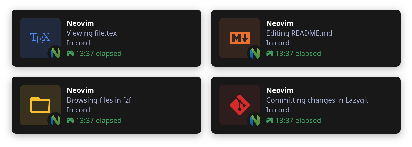 I'm the sole maintainer of cord.nvim and dedicate much of my free time to this project. If you find Cord helpful, you can show your support by giving the repo a star or sponsoring me on GitHub. Every bit of support helps me continue to improve and maintain Cord for everyone. Thank you!