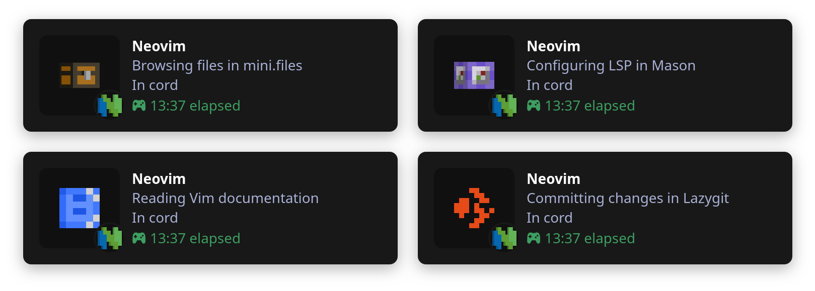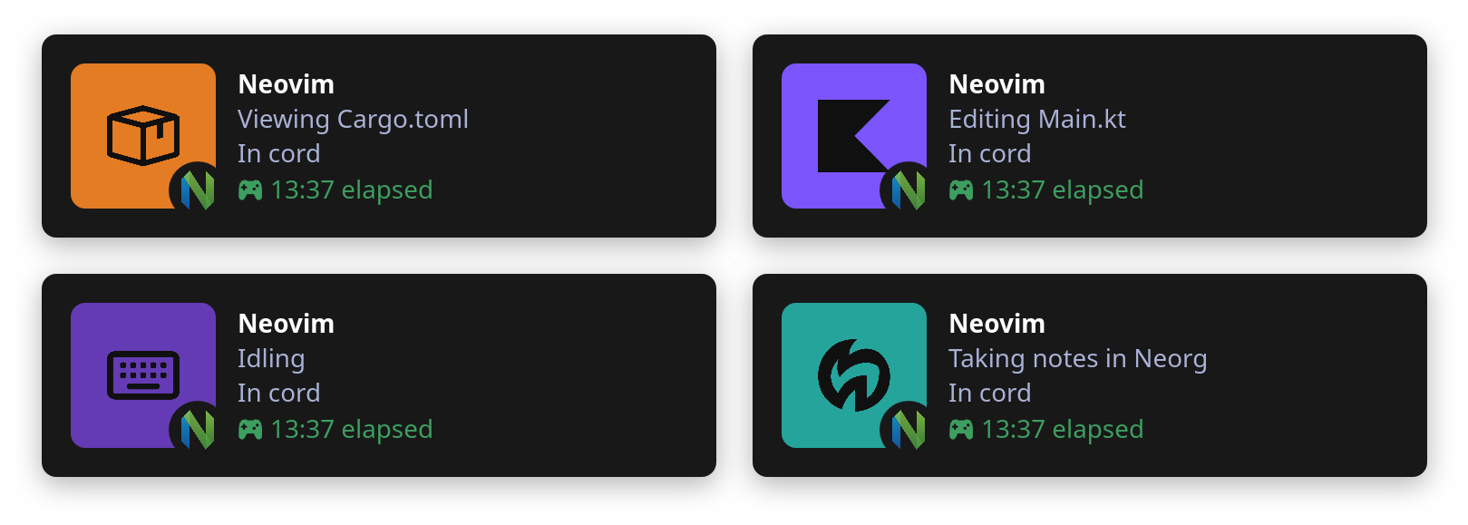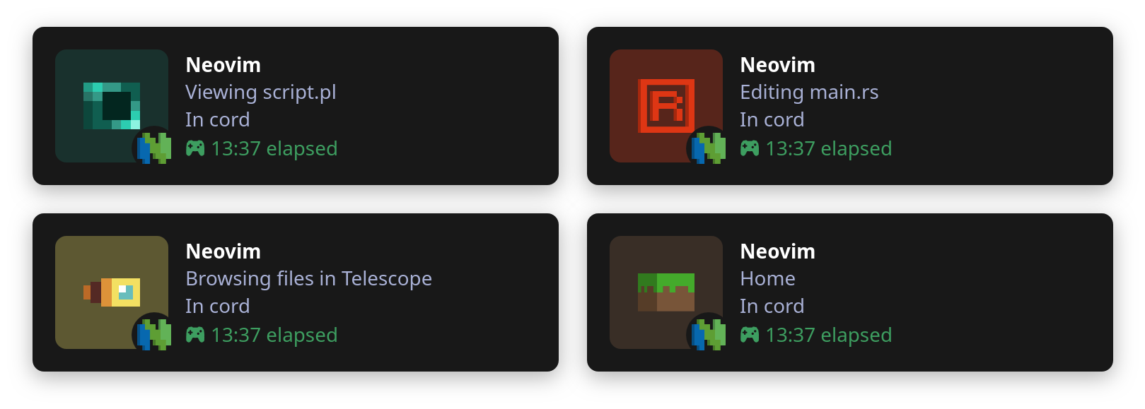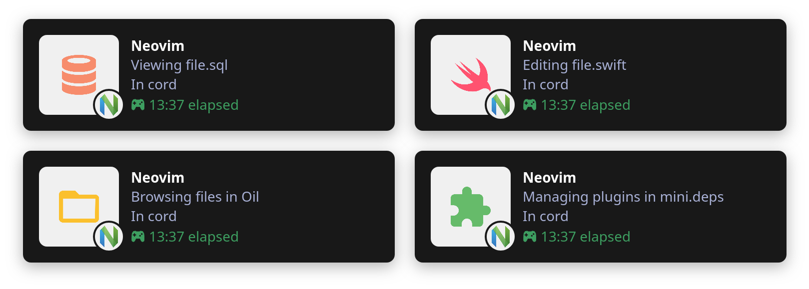 vim.pack.add { 'https://github.com/vyfor/cord.nvim' }require('cord').setup { -- ... }