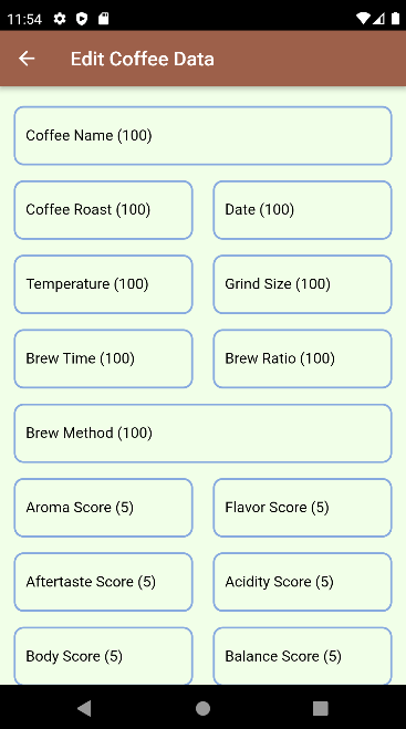 - Add Coffee Note: Tap the floating button to go to the "Add Data" screen, where users can rate their coffee based on several aspects like temperature, grind size, brew time, and brew method.