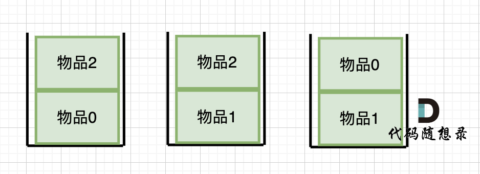 dp[2][2] = 3,即 放物品0 和 放物品1、放物品0 和 物品 2、放物品1 和 物品2, 如图所示,三种方法: