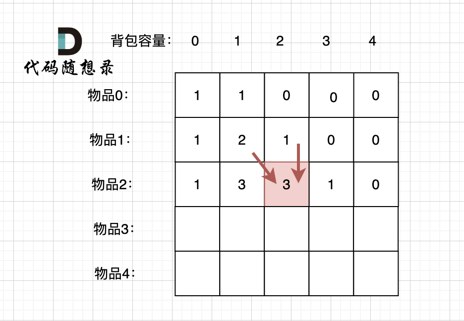 有 dp[1][2] 种方法,即 背包容量为2,只考虑物品0 和 物品1 ,有 dp[1][2] 种方法,如图: