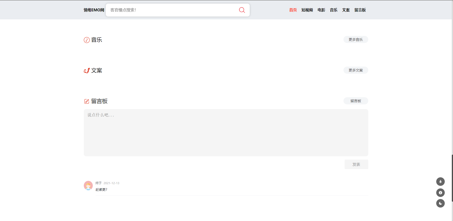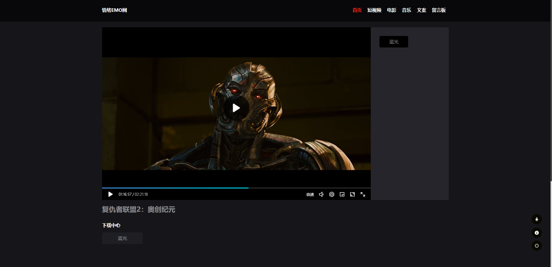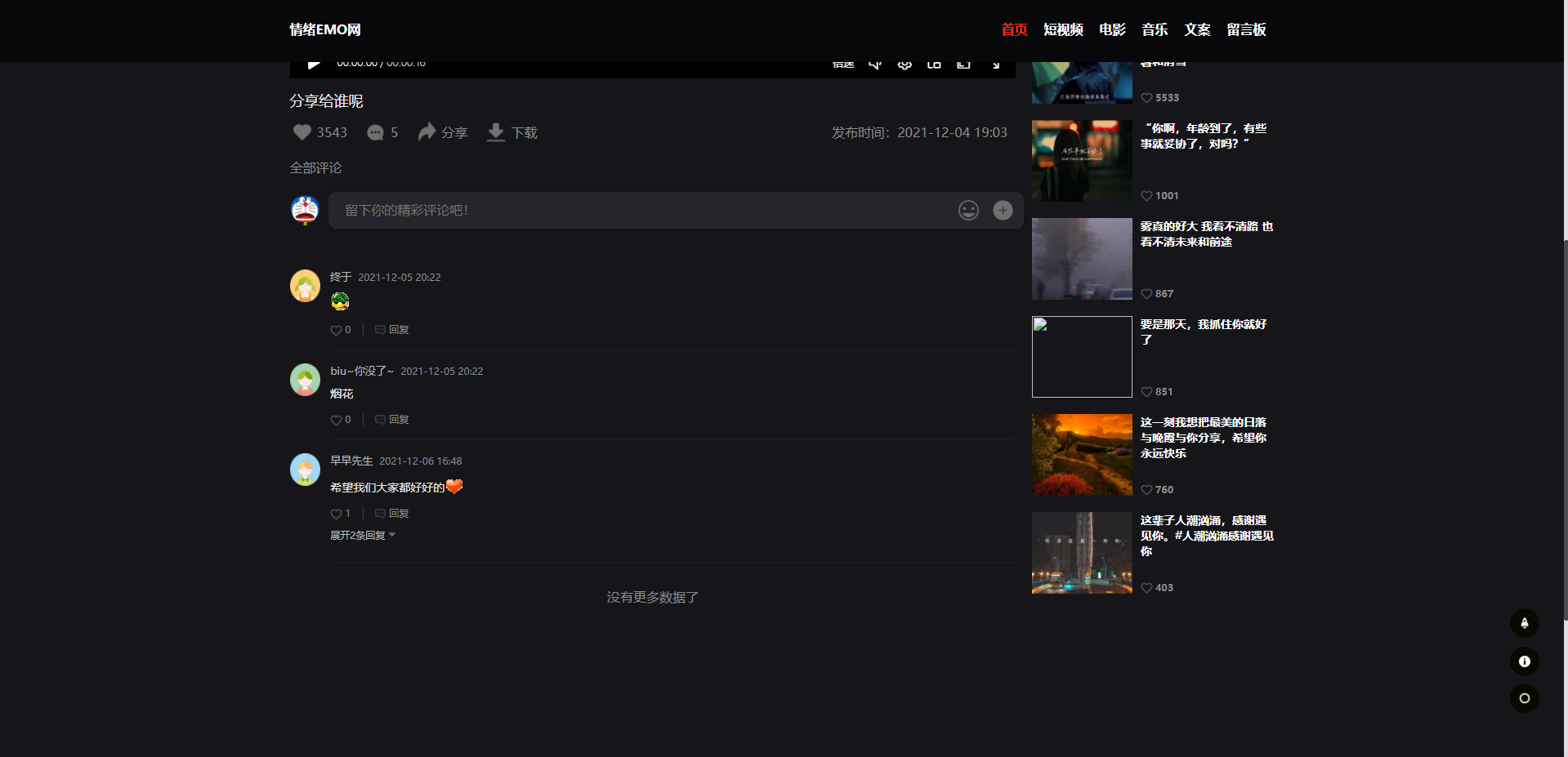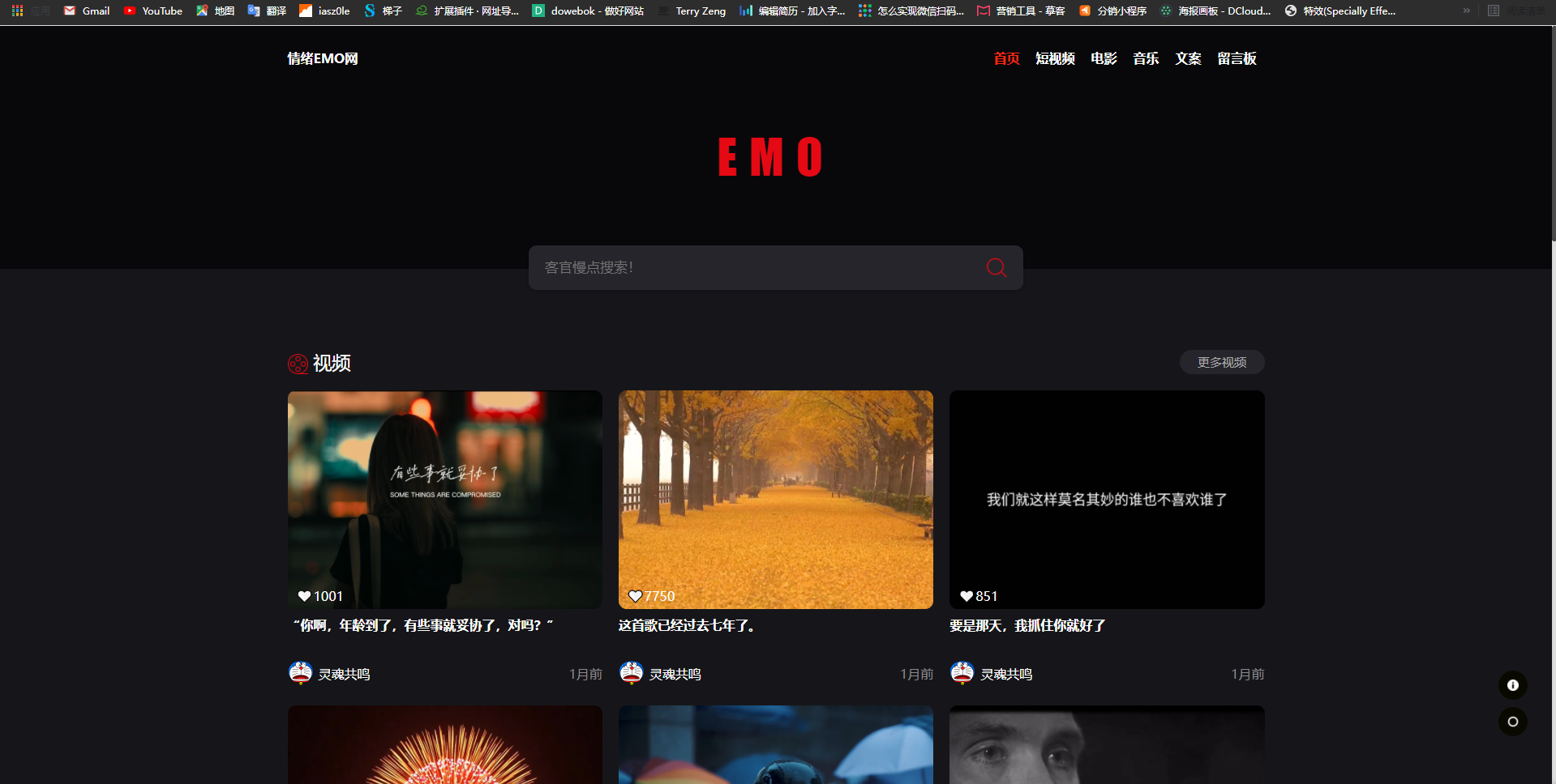 emo 前端:主要使用技术 Vue3 + axios + vue-router4 + vuex 后端:主要使用技术 Nodejs + mongodb 包含主题切换,电影观看,多级评论,表情包评论,下载电影以及电视剧