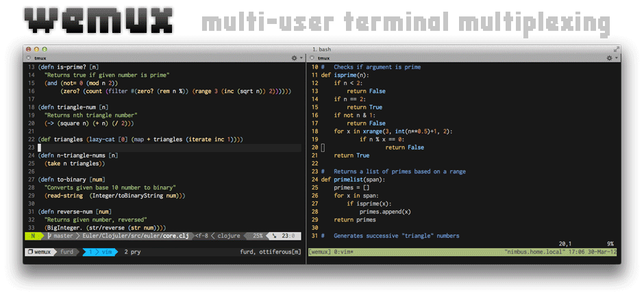 wemux enhances tmux to make multi-user terminal multiplexing both easier and more powerful. It allows users to host a wemux server and have clients join in either: