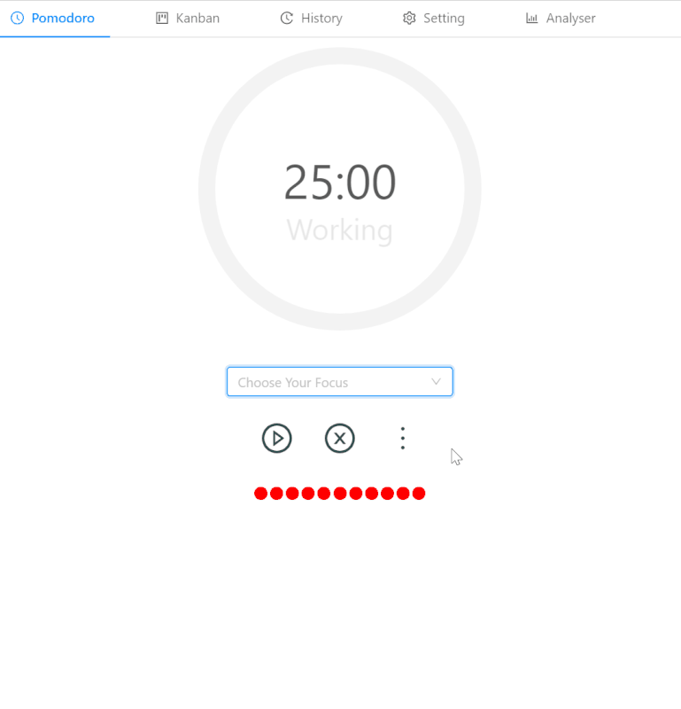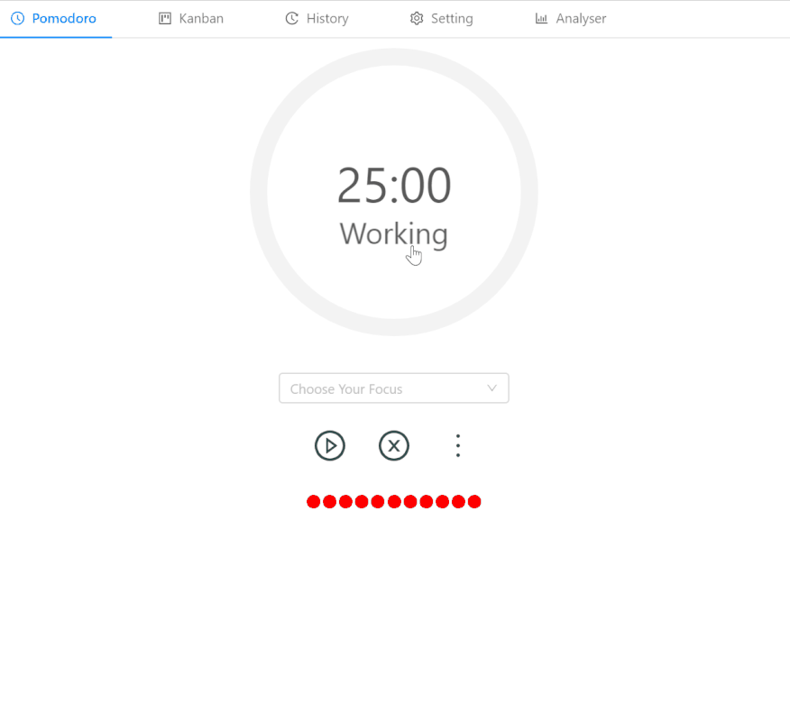 The working loop in the Pomodoro Technique is split into a 25-minute focus session and a 5-minute rest session. During a work session, the user focuses on one todo item and should not do anything irrelevant. The Pomodoro Technique can greatly improve the efficiency of work and study and alleviate work fatigue.